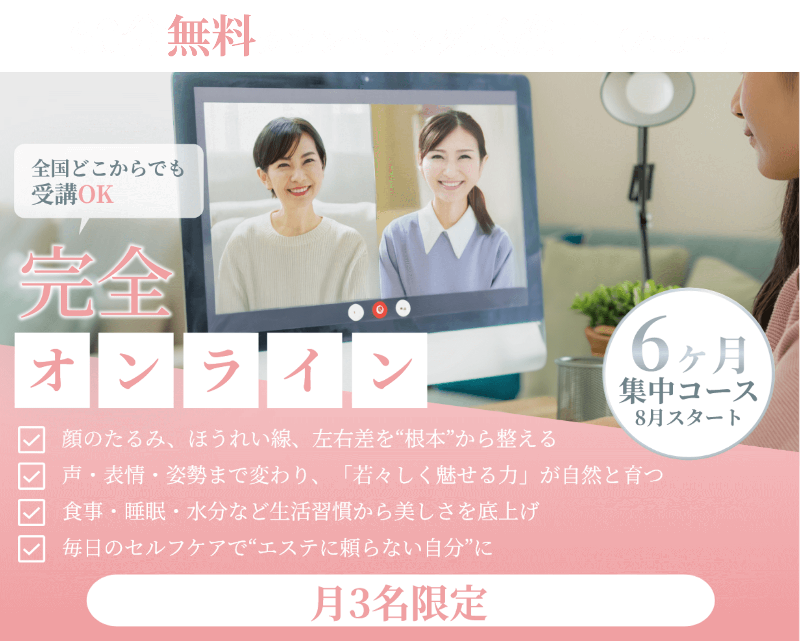 声・表情筋・呼吸・姿勢まで整える“美顔ボイトレ”で、たるみ・ほうれい線・目元の変化はもちろん、生活習慣から全身を整える本質的な若返りへ。